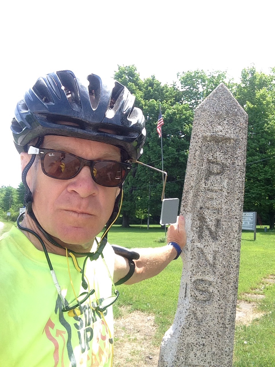 I stopped @ the old stone Pa stone marker that stands on the Pa -OH border for a picture. I have 2 pictures of Garth standing there touching the gritty, hard to read marker, once @ the completion of his Run X Pa & the other as he entered the state from the west on his Run X America. I felt a connection of sorts with him as I stood there touching that same old gritty stone marker.
