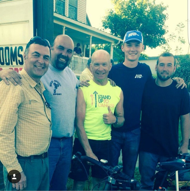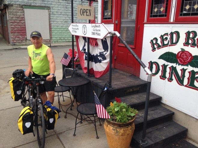 I left my home town running a little late & made my way into downtown Towanda where I was invited to breakfast @ the “Red Rose Diner” I was met by the owner Joseph Dupont . This guy is a real promoter of the iconic  Rt 6. Everyone that walks, runs or bikes out Rt6 makes the stop @ the diner. The diner is a perfectly preserved diner, located in the downtown. After buying my breakfast & taking about the Rt 6 story & about my trip they presented me with a donation toward Justin’s cause. Thanks Joseph. I then worked my way through the scattered rain showers down Rt 6 , stopping by my buddy Tracy Keeneys place for a short visit in Wyalusing where he promised me he would be riding with me on my next X America trip! He’s crazy enough & tough enough that he will do it.